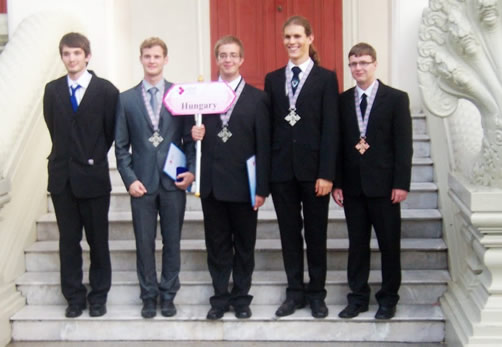 (A magyar fizika diákolimpiai csapat tagjai, balról jobbra: Jéhn Zoltán, Varga Ádám, Szabó Attila, Börcsök Bence, Budai Ádám)