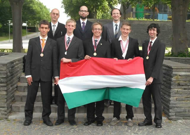 (A magyar fizika diákolimpiai csapat és kísérőik: első sor, balról jobbra: Papp Roland, Juhász Péter, Szabó Attila, Jenei Márk, Kovács Áron; hátsó sor: Simon Péter, Vigh Máté, Tasnádi Tamás.)