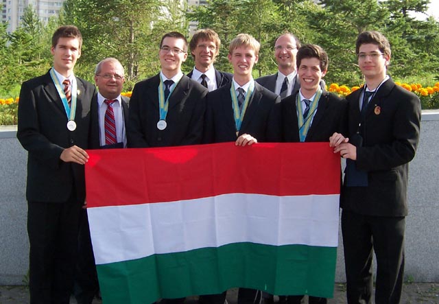 A magyar fizika diákolimpiai csapat és kísérőik (balról jobbra): HolczerAndrás, Hóbor Sándor, Öreg Botond, Vankó Péter, Juhász Péter, Tasnádi Tamás, Takátsy János, Horicsányi Attila.
